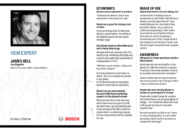 The goal of this project was to understand, why diesel passanger cars are not as popular as their gasoline counterparts in the US market. The State of California has been selected to be the location for the first phase of research/interviews.