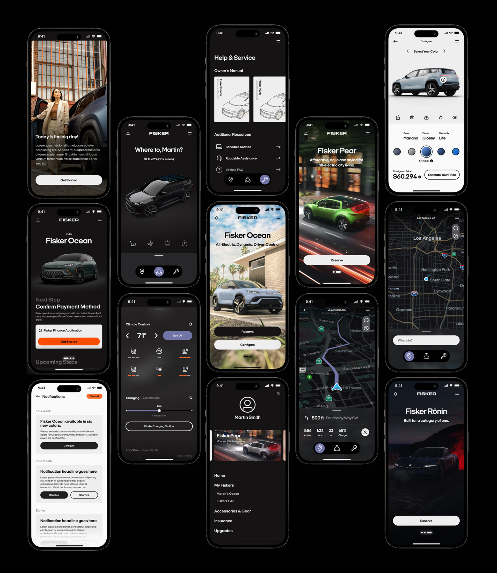 In January 2022, with the relaunch of our website and mobile app, our objective was to visually express the essence of the Fisker brand. We opted for bold geometric sans-serif typography set against a minimalist backdrop, complemented by dynamic photography inspired by California's landscapes and a vibrant color palette. This design approach was crafted to embody our dedication to sustainability, innovation, and exceptional design, aligning our digital presence with the dynamic spirit and visionary leadership of Henrik Fisker.