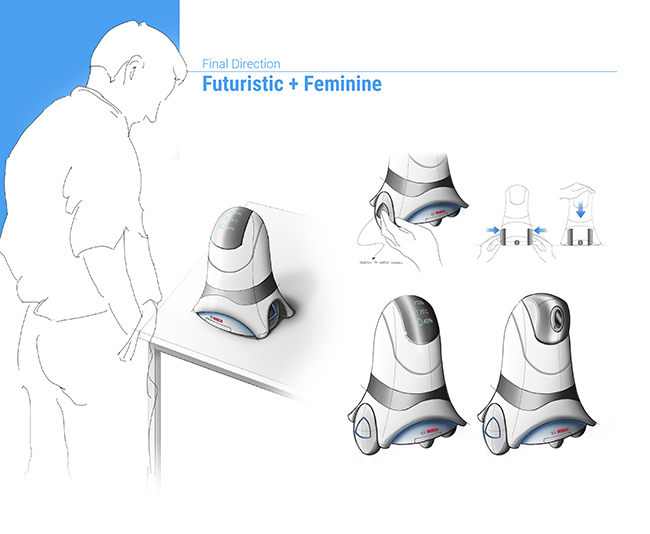 The robotic project is targeted for users living in studios or 1-2 bedroom apartments in California Bay Area with security concerns. The design result is an interactive security robot patrolling home environment. It delivers security information to the resident on its display, and connected to smart phone and other smart home system products. If functions as hub for central control of smart home system and act as home butler and life copanion with humanized emoticons interfaces.