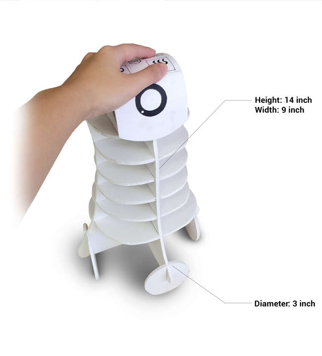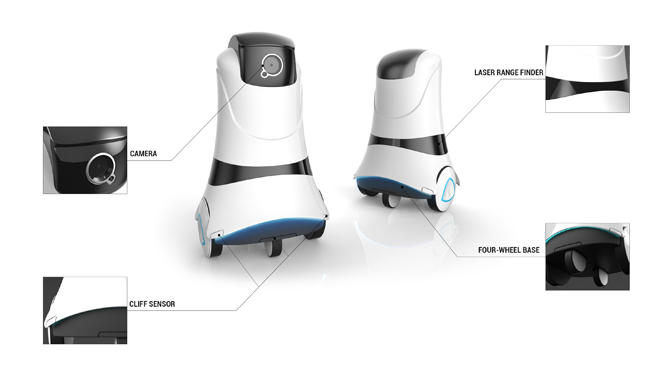 The robot is supported by cliff sensor and laser ranger finder to detect surrounding environment and four-wheel base to facilitate its mobility. On patrol mode while the resident is not at home, the inside camera will pop out for a wide angel camera view of home monitoring and sync the real-time video recording with smart phone.